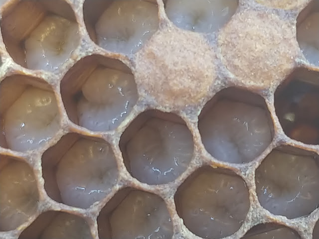The main driver of the hive aside from the queen is the brood. A hive should have eggs, open larvae and capped brood. I raise hygienic queens so looking at a frame of capped brood for pattern is no longer a good indicator. We need to pull frames of open larvae to assess good brood pattern. This is because hygienic queens will produce capped brood frames that may look "shotgun" in pattern. An open brood frame will show the true state of pattern before hygienics kick in.