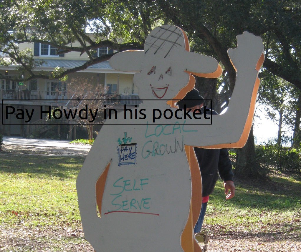 We affectionately call him Howdy Man. He will be at the farm stand on the East side of Beach Park in Pascagoula WEEKENDS 9am-5pm. *Except in threatening and bad weather. Howdy doesn't talk much but he will let you serve yourself, just pay Howdy in his pocket.