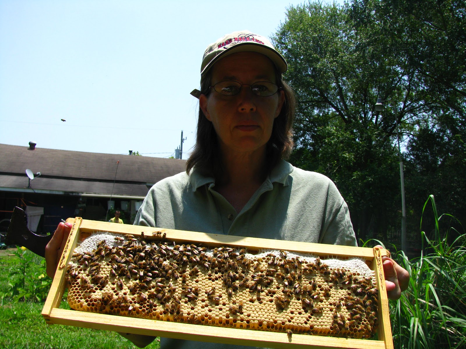 Earlier this summer we were quoted in the Mississippi Press. Our 15 minutes of fame! The bees were the subject and mosquitoes were the problem. Seen below is a frame full of capped brood (developing bees), a delight for the beekeeper.